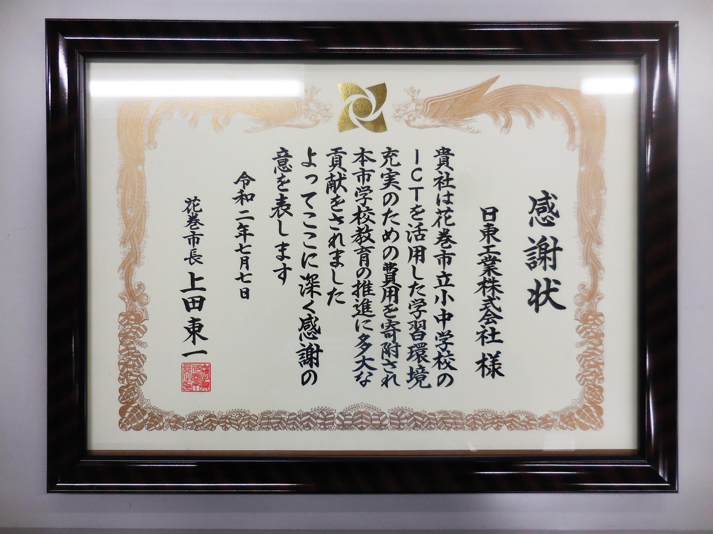 花巻市感謝状」をいただきました。
