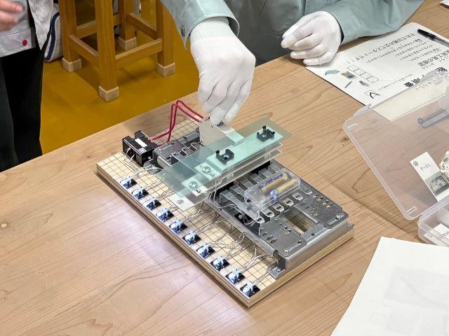 生徒たちは、過電流などの異常から家財や建物を守るための「電気の安全装置」としての重要性を学習しました。身近な電気の安全を支える製品の意義について興味・関心を深めることで、その後の作業への意欲を高めました 。