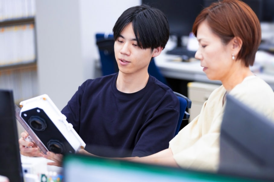 製品開発のための専門知識、最適な顧客ニーズを具現化する設計のスキルなど、研修や仕事を通して常に学び続ける姿勢が必要な職種。他部門との関わりが多い部署のため、コミュニケーション能力も重要です。