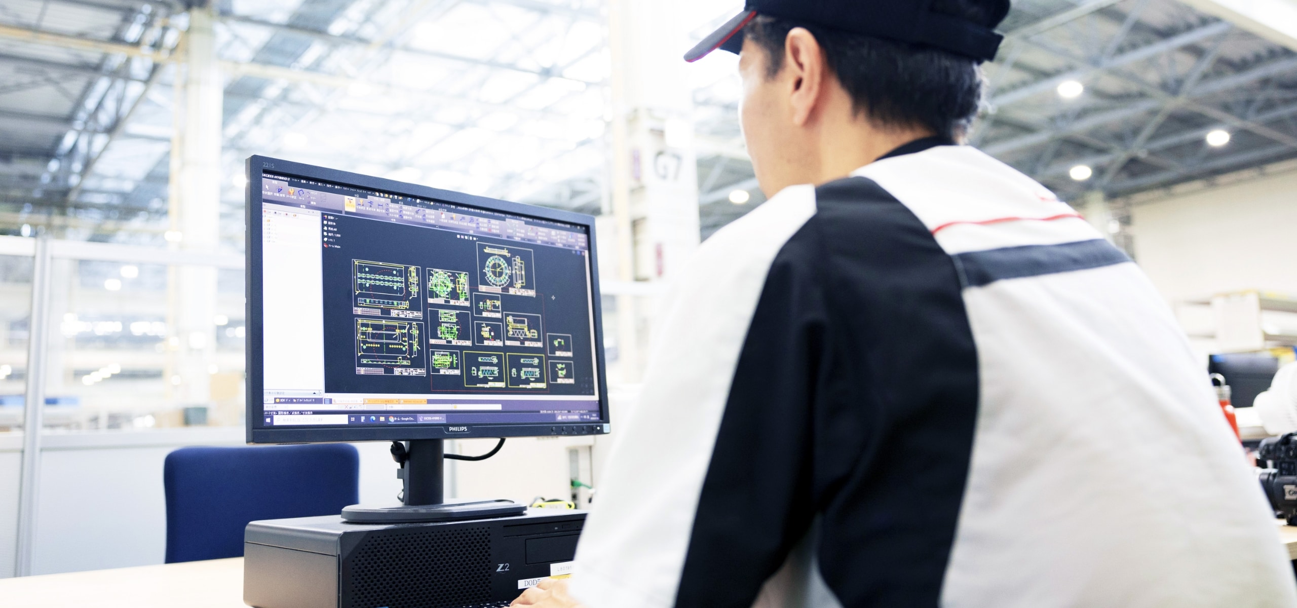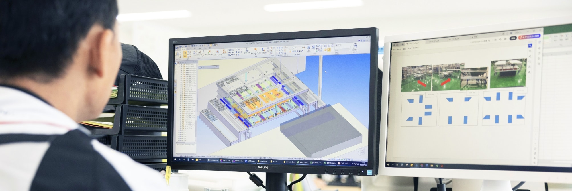 生産技術では、現場や開発部門から生産プロセスの改善、生産ラインの最適化、新製品の生産準備などの依頼を受け、設備の設計・保全・修理を行っています。生産効率化のための自動化技術導入、生産コスト削減のための工程改善なども生産技術職の仕事。CADを使って設備・治具・金型を設計し、部品加工や組み立てを経て、実際に稼働するまでの一連の業務を担います。設備を動かす制御も設計し、プログラムも作成します。また、不具合があった際の調整や修理の対応も行い、生産現場の稼働を正常に保つことも大きな役割の一つです。自社の製品をつくるための生産設備をつくる、縁の下の力持ちと言える職種です。